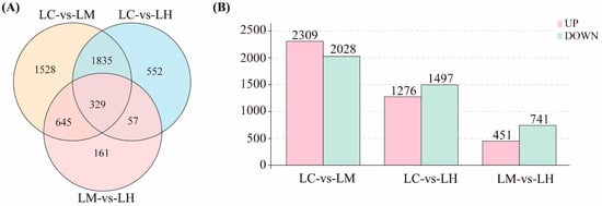 (A) Venn diagram showing the overlap of differentially expressed genes (DEGs) among three comparison groups: LC-vs-LM, LC-vs-LH, and LM-vs-LH; (B) Histogram showing the number of up-regulated and down-regulated DEGs in each comparison group.