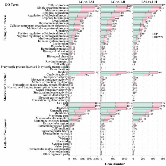 GO enrichment histograms of DEGs in LC-vs-LM, LC-vs-LH, and LM-vs-LH.