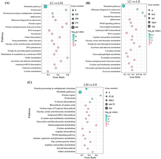 Bubble charts of the KEGG enrichment analysis of the top 20 pathways of the DEGs in the LC-vs-LM (A), LC-vs-LH (B), and LM-vs-LH (C).