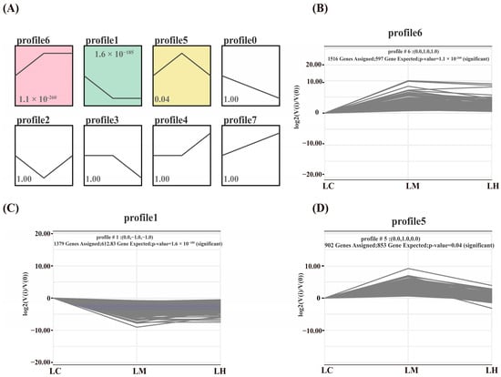 A total of three significantly enriched gene expression profiles (p < 0.05) were identified through STEM analysis: Profile 6 (p = 1.1 × 10-260), Profile 1 (p = 1.6 × 10−185), and Profile 5 (p = 0.04) (Figure 5). Among them, Profile 6 and Profile 1 exhibited completely opposite expression patterns. Profile 6 and Profile 1 contained 1516 and 1379 genes, respectively. Compared to the LC group, the majority of DEGs in Profile 6 were significantly up-regulated in both the LM and LH groups, whereas the genes in Profile 1 were markedly down-regulated in these two groups. Profile 5 included a total of 902 genes, with expression levels peaking in the LM group and remaining relatively low in the LC and LH groups.
