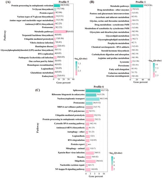 Top 20 pathways for KEGG enrichment analysis of DEGS in Profile 5 (A), Profile 1 (B), and Profile 6 (C).