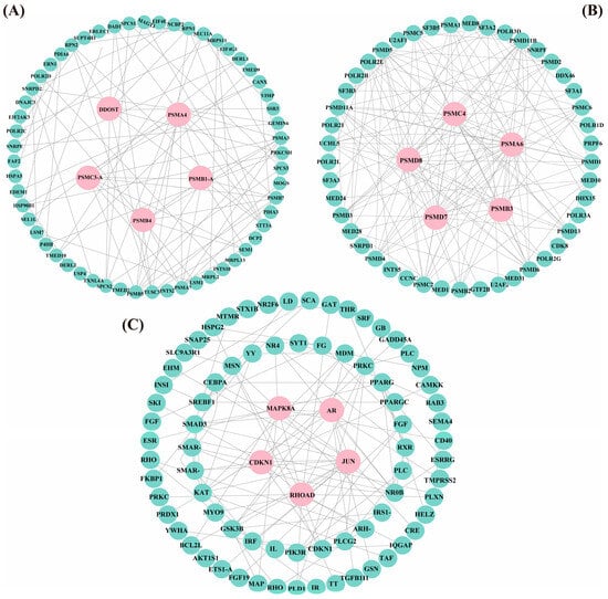 PPI network diagrams of the genes in Profile 5 (61 genes, 200 edges; (A)), Profile 6 (50 genes, 200 edges; (B)), and Profile 1 (80 genes, 200 edges; (C)). Hub genes are shown in pink, while other genes are shown in green. (For interpretation of the references to color in this figure legend, the reader is referred to the web version of this article).