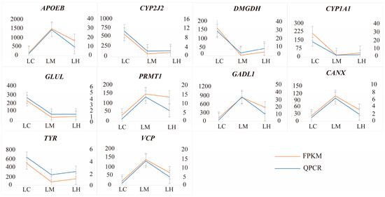 qRT-PCR validation results of 10 randomly selected genes. The right Y-axis represents the relative gene expression levels obtained by RT-qPCR using the 2−ΔΔCT method, while the left Y-axis represents the relative expression levels from RNA-Seq data based on the FPKM method.