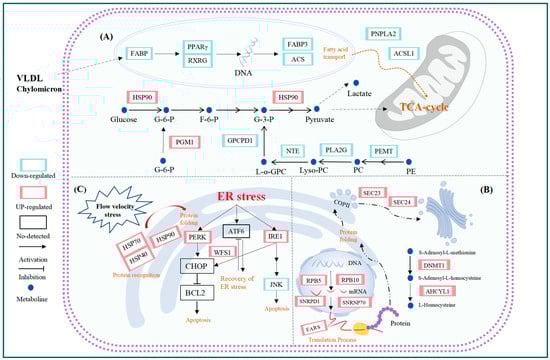 Some pathways affected by water velocity stress: (A) lipid metabolism; (B) protein metabolism; (C) Correct protein folding and UPR reactions.