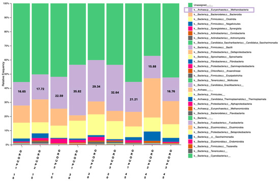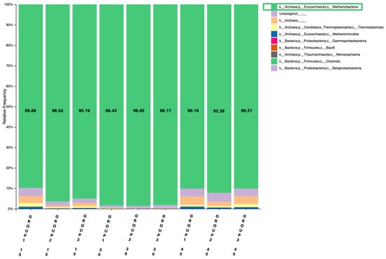 The second barplot revealed a similar pattern regarding the abundance of methanobacteria between the different sampling days. More specifically, Methanobacteria were increased in all feeding groups from day 15 to day 30, followed by a reduction on day 45 (Figure 2). On day 30, the percentage of Methanobacteria was approximately 98% in all three groups, aligning with the increased energy demands during the lactation peak, followed by a reduction as energy requirements declined. Again, Group 1 showed a slight increase in Methanobacteria between 15 and 45 time-points, whereas groups 2 and 3 presented a decrease of abundance in the above time frame.
