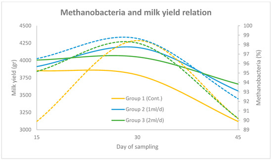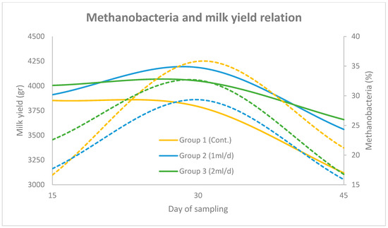 In Figure 3 and Figure 4 the correlation between Methanobacteria abundance and milk yield (group mean) over the three sampling periods (days 15, 30 and 45), across the three experimental groups (using the two primer sets), is illustrated. The solid lines represent the progression of milk yield, while the dashed lines denote Methanobacteria proportions. The results obtained using the universal prokaryotic and the archaeal primer pairs follow the same motif. More specifically, in Group 1, milk yield increased steadily to a peak on day 30 before declining, which coincided with a sharp rise in Methanobacteria levels. In Group 2, milk yield followed a similar trend, though Methanobacteria levels peaked slightly earlier and remained lower than Group 1 throughout the trial. In Group 3, both milk yield and Methanobacteria levels were more stable, with a moderate peak on day 30 and a noticeable reduction in Methanobacteria abundance by day 45.