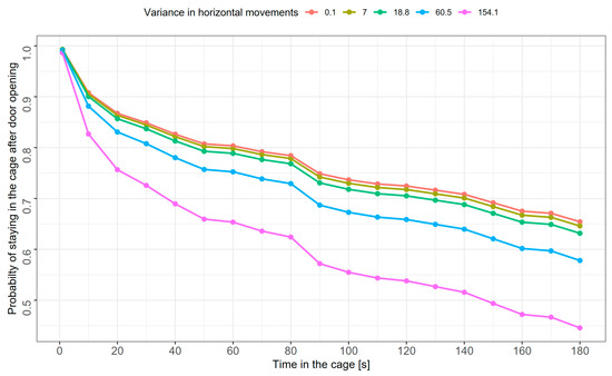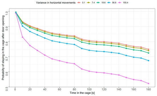 Estimated probability curves of staying in the cage after opening the door for immature sedge warblers (both sexes combined) with various levels of horizontal activity, expressed as the variance of movements along the cage’s horizontal axis. Presented levels represent the 10th, 30th, 50th, 70th, and 90th percentile values of variance in horizontal movements (from left to right in the legend).