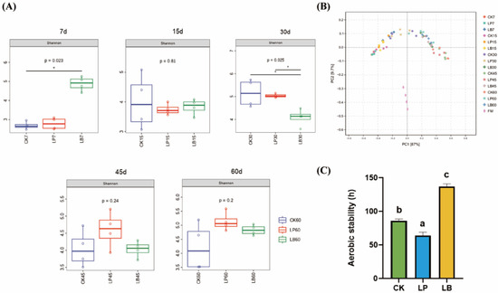 - Cao, C.; Bao, W.; Li, W.; Zhao, F.; Kwok, L.-y.; Zhang, W.; Zhang, H. Changes in physico-chemical characteristics and viable bacterial communities during fermentation of alfalfa silages inoculated with Lactobacillus plantarum. World J. Microbiol. Biotechnol. 2021, 37, 127. [Google Scholar] [CrossRef]