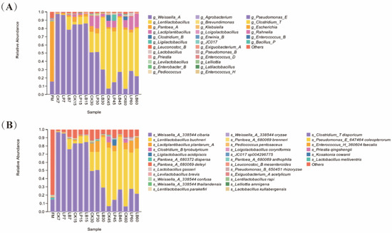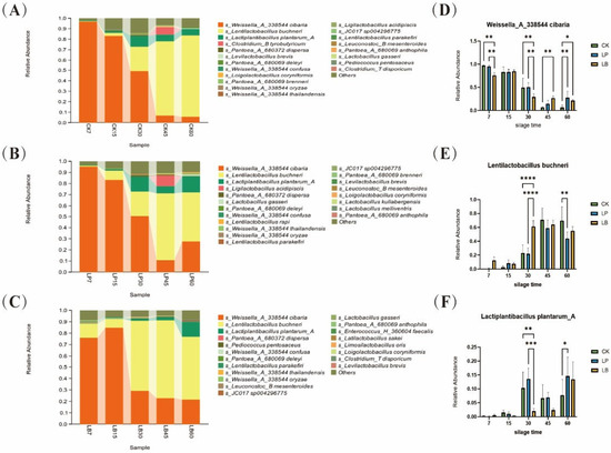 4.4. Effect of Different Types of LAB on the Bacterial Community Diversity, Composition and Succession of Silphium perfoliatum L. Silage