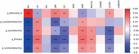 - Bai, J.; Ding, Z.; Su, R.; Wang, M.; Cheng, M.; Xie, D.; Guo, X. Storage Temperature Is More Effective Than Lactic Acid Bacteria Inoculations in Manipulating Fermentation and Bacterial Community Diversity, Co-Occurrence and Functionality of the Whole-Plant Corn Silage. Microbiol. Spectr. 2022, 10, e0010122. [Google Scholar] [CrossRef]