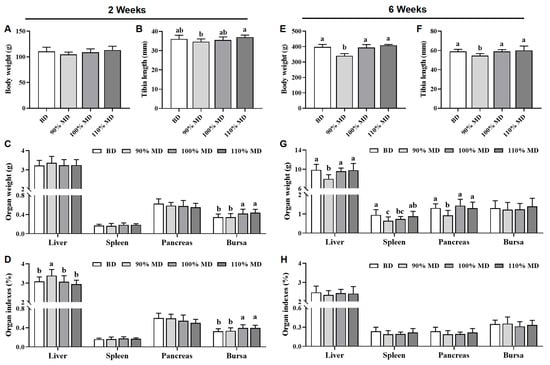 Effect of model diet on body weight (A,E), tibia length (B,F), main organ weight (C,G), and organ indexes (D,H) of Jing Tint 6 chicks at the 2nd and 6th weeks. Values are means ± SD, n = 12. Labeled means in a row with different letters differ significantly, p < 0.05. BD, basal diet; MD, model diet.