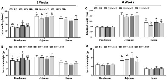 The lengths and weights of the chicks’ small intestines are shown in Figure 2. At the 2nd week, compared to the BD, the 100% MD increased (p < 0.05) duodenum weight, while the 90% MD decreased jejunum length (Figure 2A,B). At the 6th week, compared to the BD, the 100% MD increased (p < 0.05) jejunum weight, while the 90% MD decreased ileum length (Figure 2C,D). Notably, no differences (p > 0.05) were found in the length and weight of parts of the small intestine, including the duodenum, jejunum, and ileum, between the BD and the 110% MD at the 2nd and 6th weeks (Figure 2).
