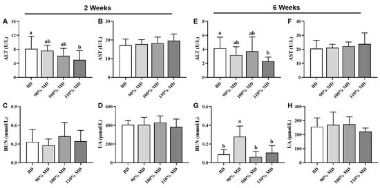 The serum biochemistry results are shown in Figure 3. At the 2nd week, compared to the BD, the 110% MD reduced (p < 0.05) serum ALT, while no differences (p > 0.05) were found in serum AST, BUN, and UA among the four groups (Figure 3A–D). At the 6th week, compared to the BD, the 110% MD also reduced (p < 0.05) serum ALT; the 90% MD increased serum BUN, while no differences (p > 0.05) were found in serum AST and UA among the four groups (Figure 1E–H).