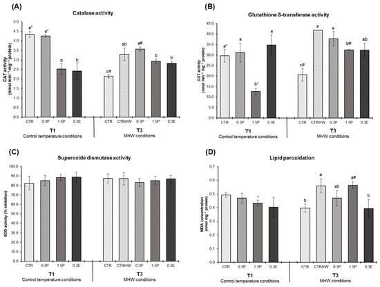 Oxidative stress biomarkers in the liver of S. aurata fed the experimental diets after 30 days of supplementation control temperature conditions (T1) and after 7 days of exposure to the MHW peak temperature alone (T3) (mean ± SD; n = 6). (A)—catalase (CAT) activity (nmol min−1 mg−1 protein); (B)—glutathione S-transferase (GST) activity (nmol min−1 mg−1 protein); (C)—superoxide dismutase (SOD) activity (% inhibition); and (D) lipid peroxidation (LPO, expressed as MDA concentration, nmol mg−1 protein). Different letters denote significant differences between treatments on the same sampling time and different symbols (* and #) indicate significant differences between sampling times (T1 and T3) for the same treatment (p < 0.05). The absence of letters or symbols indicates no statistical difference. Abbreviations: CTR—control feed; CTRHW—control feed exposed to MHW conditions; 0.3P—feed supplemented with 0.3% of dried powdered L. digitata; 1.5P—feed supplemented with 1.5% of dried powdered L. digitata; 0.3E—feed supplemented with 0.3% of L. digitata extract; MDA—malondialdehyde.