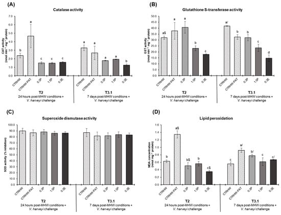 Oxidative stress biomarkers in the liver of S. aurata fed the experimental diets following 24 h after exposure to the MHW peak temperature and V. harveyi challenge (T2) and after 7 days of exposure to a combination of the MHW peak temperature and the V. harveyi challenge (T3.1) (mean ± SD; n = 6). (A)—catalase (CAT) activity (nmol min−1 mg−1 protein); (B)—glutathione S-transferase (GST) activity (nmol min−1 mg−1 protein); (C)—superoxide dismutase (SOD) activity (% inhibition); and (D)—lipid peroxidation (LPO, expressed as MDA concentration, nmol mg−1 protein). Different letters denote significant differences between treatments on the same sampling time and different symbols ($ and /) indicate significant differences between sampling times (T2 and T3.1) for the same treatment (p < 0.05). The absence of letters or symbols indicates no statistical difference. Abbreviations: CTR—control feed; CTRHW—control feed exposed to MHW conditions; 0.3P—feed supplemented with 0.3% of dried powdered L. digitata; 1.5P—feed supplemented with 1.5% of dried powdered L. digitata; 0.3E—feed supplemented with 0.3% of L. digitata extract; MDA—malondialdehyde.