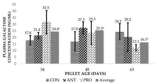 As shown in Figure 1, no effect was observed between diets and their interactions regarding the intestinal integrity of piglets when considering the galactose absorption capacity (p > 0.10). Nevertheless, on d 34 and 49 of age, plasma galactose concentrations were higher (p < 0.05) for all treatments when compared to d 63 of age.