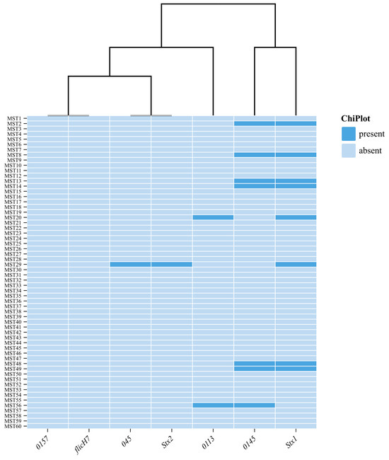 The major virulence/toxin genes, including Enterohemorrhagic Flagella H7 E. coli (flicH7) and rfbO157, a virulence gene that codes for the O-antigen specific to the E. coli O157:H7 strain and serogroup 0157, were not detected in any of the isolates; nine (15%) isolates harbored stx1, and only one isolate harbored stx2. One (1.7%) harbored a combination of stx1 and stx2 genes. Shiga-like toxin-producing E. coli 045 and 0113 were detected in 7/60 (11.7%) and 2/60 (3.3%), respectively (Figure 1).