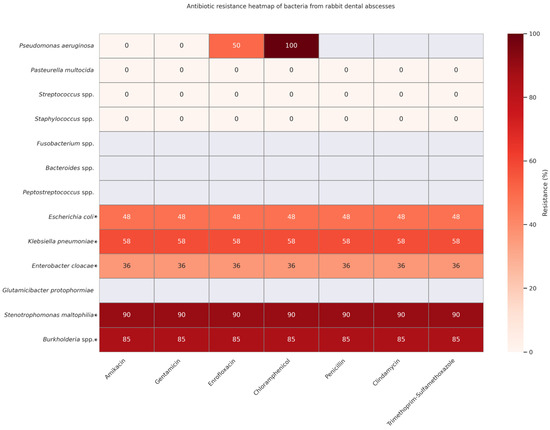 Antibiotic resistance heatmap of 421 bacterial isolates cultured from rabbit odontogenic abscesses in six peer-reviewed studies—Fernández et al., 2023 [1], Tyrrell et al., 2002 [13]; Gardhouse et al., 2017 [51]; Crăciun et al., 2025 [52]; Levy & Mans, 2024 [53], and Jekl et al., 2023 [54]. Cells are color-coded from white (0% resistant) to dark red (100% resistant). For each species–drug pair, % R = (number of resistant + intermediate isolates ÷ number tested) × 100; if a study did not test a drug, it was excluded from that denominator. Rows marked with an asterisk (*) and shaded light grey originate from a single dataset that used the same seven-drug panel for all Enterobacterales isolates; hence, these rows share identical percentages.