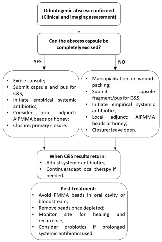 Surgery is the cornerstone of treating rabbit odontogenic abscesses because antibiotics alone cannot penetrate the fibrous capsule, necrotic bone, or dense caseous pus that characterize these infections [59,76,77,78]. The ideal operation achieves three goals: (i) the en bloc excision of the capsule, (ii) the extraction of the diseased cheek tooth (including any reserve-crown fragments), and (iii) the aggressive curettage of osteomyelitic bone [59,76,79]. When anatomic constraints preclude complete removal, the surgeon should perform maximal debridement and then create a permanent drainage route—either marsupialization or wound-packing—to allow repeated flushing or topical therapy [59,62,80,81]. Pre-operative radiography or CT defines the lesion’s extent and guides the choice between full excision, marsupialization, or packing, especially when mandibular or maxillary bone is involved [37,70,79]. Tooth extraction is mandatory whenever the abscess originates from an infected apex [59,70]. In every case, the capsule and pus are submitted for culture; systemic antibiotics are started empirically and adjusted once the results return, while local adjuncts (e.g., PMMA beads or Manuka honey) support bacterial clearance [29,62,76,77,79]. This combined surgical-and-medical strategy offers the best chance of long-term resolution. Beyond surgical debridement and targeted antimicrobials, robust pain control (e.g., meloxicam 0.2–0.3 mg kg−1 PO q24 h or buprenorphine 0.03 mg kg−1 SC q8 h) and proactive nutritional support with high-fiber critical-care formulas are essential adjuncts; they minimize ileus, maintain body condition, and enhance overall recovery [36,46].