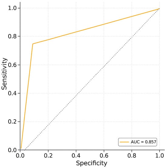Receiver operating characteristic (ROC) curve analysis. The ROC curve illustrates the trade-off between sensitivity and specificity for the diagnostic test. The area under the curve (AUC) is 0.857, reflecting a strong ability to discriminate between positive and negative cases (sensitivity: 78.6%; specificity: 75%).