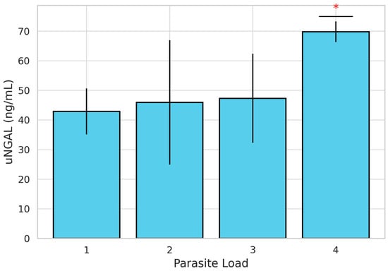 Parasitic burden was also evaluated, with 22 dogs classified as having a low burden (scores 1 and 2) and 20 dogs classified as having a high burden (scores 3 and 4). When stratified by PH status, 39.3% (n = 11) of dogs in Group A and 64.3% (n = 9) in Group B showed a high parasite burden. However, the difference between groups was not statistically significant (χ2 =1.444; p = 0.230). When comparing uNGAL concentrations between high- and low-parasite-burden groups, although concentrations were higher in Group B, no statistically significant differences were found (Table 2). Nevertheless, the evaluation of uNGAL concentrations across individual parasite burden scores using the Kruskal–Wallis test revealed statistically significant differences (H = 12.087; p = 0.007). To further explore these differences, a post hoc pairwise comparisons using the Mann–Whitney U test with Bonferroni correction was performed. These analyses showed that uNGAL concentrations were significantly higher in dogs with a parasite burden score of 4 compared to those with a score of 3 (p = 0.007). No other pairwise comparisons between scores (1 vs. 2, 1 vs. 3, etc.) reached statistical significance (Figure 2). Dogs with a parasite burden score of 4 showed the highest mean uNGAL concentration (n = 6; 69.83 ng/mL), followed by scores of 3 (n = 14; 47.85 ng/mL), 2 (n = 19; 46.36 ng/mL), and 1 (n = 3; 41.08 ng/mL), suggesting a positive association between parasitic burden and uNGAL levels.