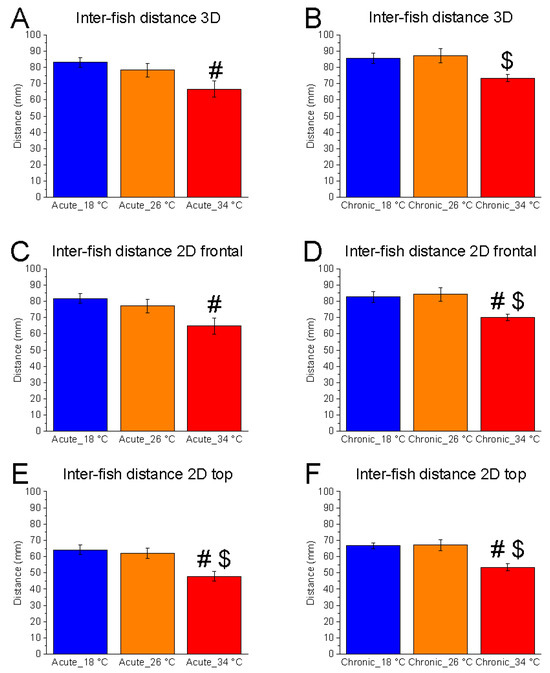 Effects of temperature on inter-fish distance. Effects of acute (A,C,E) and chronic (B,D,F) thermal exposure on inter-fish distance in 3D space (A,B), 2D vertical plane (C,D), and 2D horizontal plane (E,F). Detailed statistical values are reported in Table S1. Statistical significance: p ≤ 0.05. * 18 °C vs. 26 °C; # 18 °C vs. 34 °C; $ 26 °C vs. 34 °C. Colours indicate experimental temperatures: blue = 18 °C, orange = 26 °C, red = 34 °C.