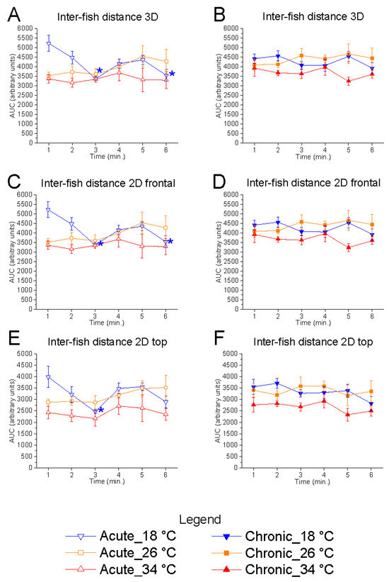 Temporal analysis over the 6 min test period revealed no significant variation in inter-fish distance at either 26 °C or 34 °C (Figure 2). However, under acute exposure to 18 °C, a significant effect of time was detected in 3D (F(5, 25) = 5.81, p = 0.0011, power (1 − β) = 0.988), 2D vertical (F(5, 25) = 5.98, p = 0.0009, power (1 − β) = 0.989), and 2D horizontal planes (F(5, 25) = 3.98, p = 0.0086, power (1 − β) = 0.900), characterised by higher inter-fish distances at the start of the test followed by a decline. No such effect was observed at 18 °C under chronic conditions. These results suggest that acute exposure to low temperatures induces a dynamic modulation of inter-fish distance, a response absent at 26 °C and 34 °C.