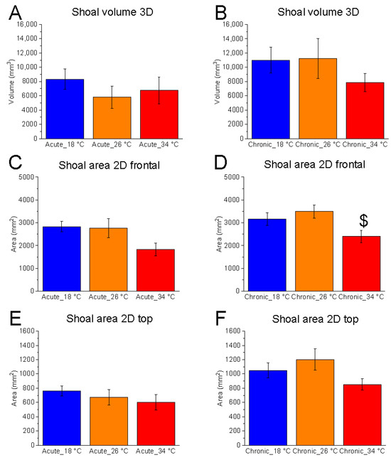 No significant differences were found between 18 °C and 26 °C. However, chronic exposure to 34 °C resulted in a reduction in vertical shoal area, suggesting increased shoal cohesion in the vertical plane (Figure 3D).