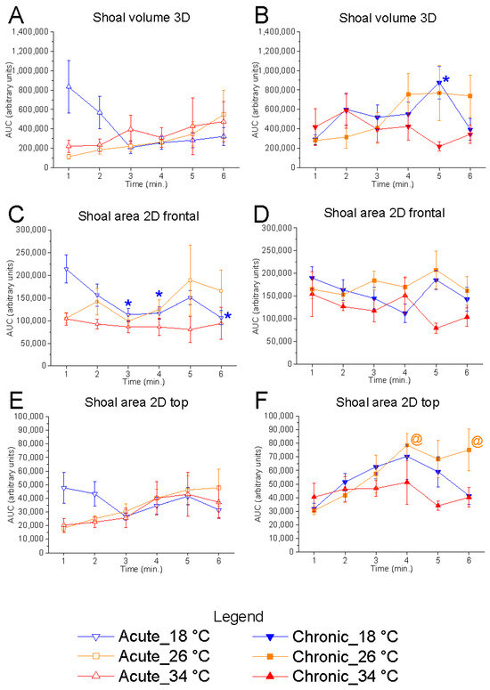 Effects of time on shoal dimensions. Effects of acute (A,C,E) and chronic (B,D,F) thermal exposure over time on shoal volume in 3D space (A,B), shoal area in the 2D vertical plane (C,D), and shoal area in the 2D horizontal plane (E,F). Detailed statistical values are reported in Table S1. Statistical significance: p ≤ 0.05. *, @, $ indicate significant differences from minute 1 at 18 °C, 26 °C, and 34 °C, respectively. Colours and geometric shapes: downward triangle (blue) = 18 °C; square (orange) = 26 °C; upward triangle (red) = 34 °C. Open symbols = acute treatment; filled symbols = chronic treatment.