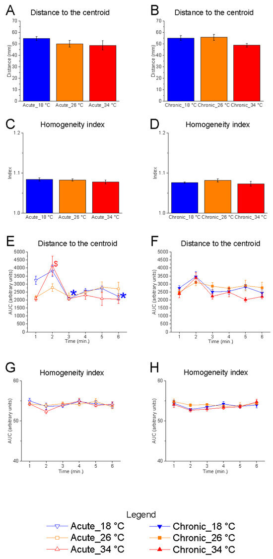 Effects of temperature and time on distance to the centroid and homogeneity index. Effects of acute (A,C,E,G) and chronic (B,D,F,H) thermal exposure on distance to the centroid (A,B,E,F) and homogeneity index (C,D,G,H). Detailed statistical values are reported in Table S1. Statistical significance: p ≤ 0.05. (A–D) * 18 °C vs. 26 °C; # 18 °C vs. 34 °C; $ 26 °C vs. 34 °C. (E–H) *, @, $ indicate significant differences from minute 1 at 18 °C, 26 °C, and 34 °C, respectively. Colour and symbol legend: downward triangle (blue) = 18 °C; square (orange) = 26 °C; upward triangle (red) = 34 °C. Open symbols = acute treatment; filled symbols = chronic treatment.