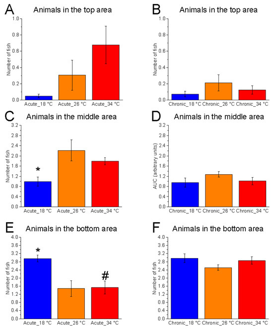 Effects of temperature on vertical shoal distribution in the vertical plane. Effects of acute (A,C,E) and chronic (B,D,F) thermal exposure on the number of zebrafish present in the top (A,B), middle (C,D), and bottom (E,F) tank zones. Detailed statistical values are reported in Table S1. Statistical significance: p ≤ 0.05. * 18 °C vs. 26 °C; # 18 °C vs. 34 °C; $ 26 °C vs. 34 °C. Colours: blue = 18 °C, orange = 26 °C, red = 34 °C.