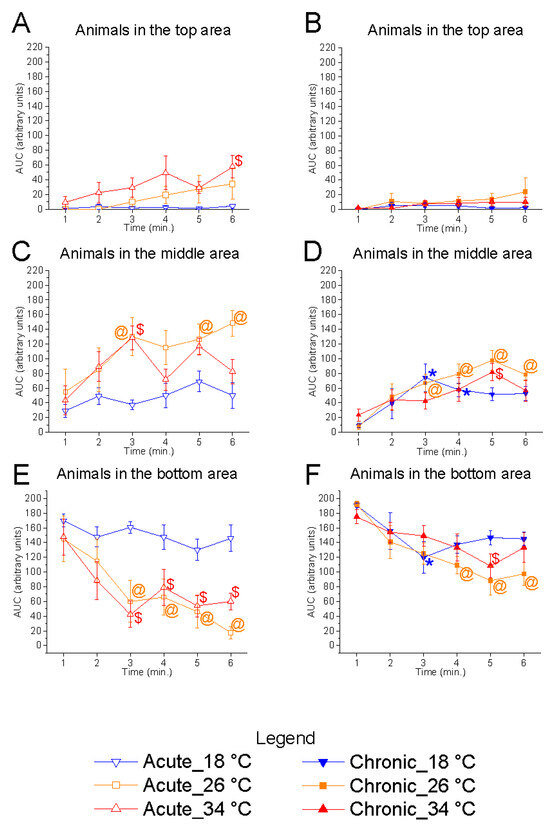 Effects of time on vertical shoal distribution in the vertical plane. Effects of acute (A,C,E) and chronic (B,D,F) thermal exposure over time on the number of zebrafish in the top (A,B), middle (C,D), and bottom (E,F) tank zones. Detailed statistical values are reported in Table S1. Statistical significance: p ≤ 0.05. *, @, $ indicate significant differences from minute 1 at 18 °C, 26 °C, and 34 °C, respectively. Colours and symbols: downward triangle (blue) = 18 °C; square (orange) = 26 °C; upward triangle (red) = 34 °C. Open symbols = acute treatment; filled symbols = chronic treatment.