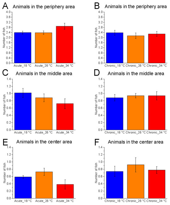 The horizontal distribution of zebrafish was not significantly affected by temperature under either acute (number of fish in the central area, F(2, 15) = 3.16, p = 0.0717, power (1 − β) = 0.598) or chronic (F(2, 15) = 0.40, p = 0.6788, power (1 − β) = 0.114) conditions (Figure 8).