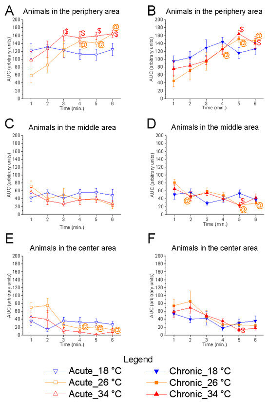 Temporal analysis revealed a significant effect of time at 26 °C in both acute (animals in the central area, F(5, 25) = 7.44, p = 0.0002, power (1 − β) = 0.980) and chronic (animals in the central area, F(5, 25) = 4.93, p = 0.0028, power (1 − β) = 0.899) conditions, characterised by a progressive reduction in the number of fish occupying the central area and an increase in the peripheral area (Figure 9). Similar trends were observed at 34 °C under both acute (F(5, 25) = 3.17, p = 0.0238, power (1 − β) = 0.615) and chronic (F(5, 25) = 6.18, p = 0.0007, power (1 − β) = 0.969) exposure. In contrast, no significant effect of time was observed at 18 °C in either condition, suggesting that at low temperature, the shoal did not modulate its exploration of the horizontal plane during the test.