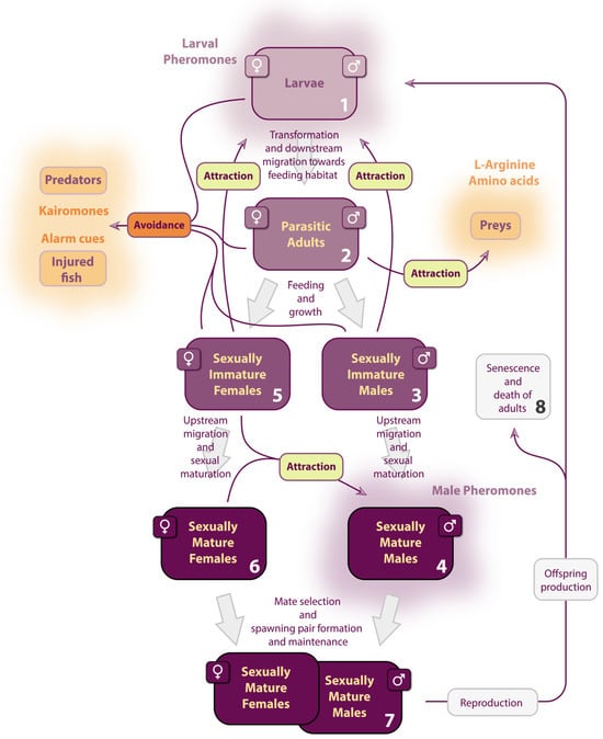The sea lamprey’s life cycle is distinctive, encompassing larval, parasitic juvenile, and reproductive adult stages. Initially, sea lampreys filter-feed as larvae for several years before undergoing metamorphosis into parasitic juveniles. At this point, they prey on fish to augment their body mass. Subsequently, adults migrate to spawning grounds to reproduce, culminating in their death. Lampreys are predominantly nocturnal animals inhabiting aquatic environments characterized by low visibility, and they exhibit solitary behavior, lacking social structures such as shoaling [1,2,3]. Throughout their life cycle, they thus rely significantly on chemosensory cues to make critical choices related to survival and reproduction (Figure 1). Accordingly, lampreys possess a highly developed olfactory apparatus capable of detecting molecules in the picomolar range, enabling them to track odor plumes in their underwater habitats. Consequently, lampreys can chemically detect fish such as preys and predators, and of course, other lampreys. Among the 41 species of lampreys, many co-exist in the same geographic areas, employing shared signaling mechanisms due to overlapping predator dynamics and habitat preferences for rearing and spawning. This review aims to synthesize the existing knowledge regarding olfactory-induced behavior throughout the life cycle of the sea lamprey, Petromyzon marinus.