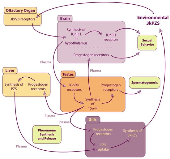 Evidence suggests that 15α-P plays a central role in mediating the downstream effects of 3kPZS exposure. Male pheromone exposure increases 15α-P levels [152], and treatments with either male pheromones or 15α-P induce both spermatogenesis [152,231] and pheromone production [153,154,231]. Since spermatogenesis is regulated by the HPG axis [191] and coincides with pheromone release [52], it was hypothesized that both processes are governed by the HPG axis [252]. More recently, researchers proposed that spermatogenesis and pheromone release were induced by the same gonadal hormone: 15α-P [155,231], because both begin when 15α-P levels peak and progestogen receptor expression increases in the mature male testes, liver, and gills [231].