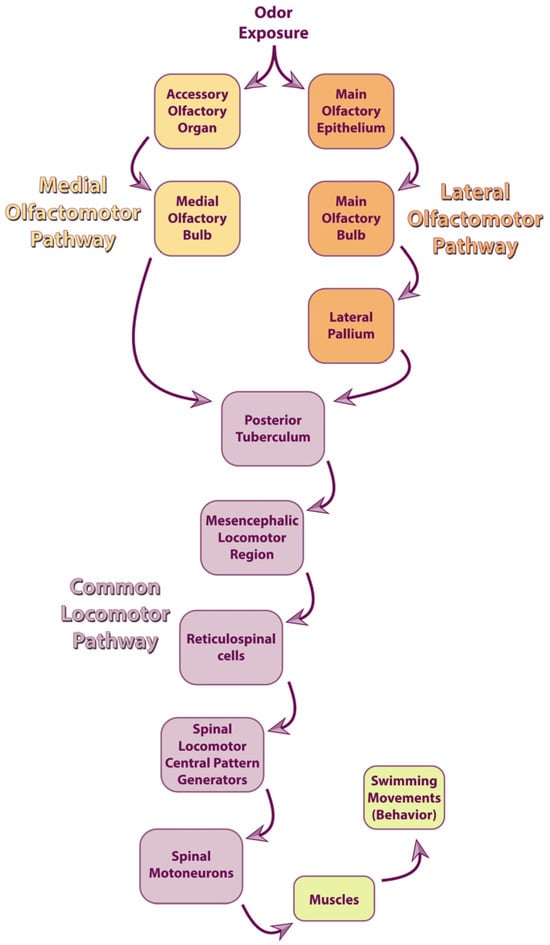 Odorants induce behavior by stimulating the central nervous system, which then generates an appropriate behavioral response. In lampreys, the neuronal signaling pathway, from odor detection in the peripheral olfactory organ, through the brain, to the spinal motoneurons that control muscle contractions and movement, has been extensively studied; for a comprehensive review, see [271]. Notably, the sea lamprey is currently the only vertebrate in which this signaling pathway has been identified [272]. Within the nasal cavity, olfactory sensory neurons detect chemosensory cues from the environment and relay signals to the OB. These signals are then processed in several brain regions, including the posterior tuberculum (PT), the mesencephalic locomotor region (MLR), and the reticulospinal (RS) neurons, before reaching the locomotor central pattern generators in the spinal cord, which generate rhythmic swimming patterns. The neuronal circuitry described in this section plays a crucial role in transforming olfactory inputs into locomotor responses.