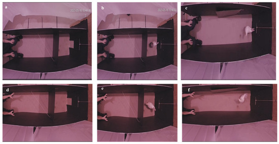 Neutral human (a) before bird entrance, and before (b) and after (c) opening the door. Threatening human (d) before bird entrance, and before (e) and after (f) opening the door.