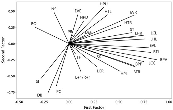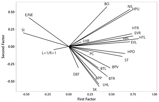 Loading coefficients > 0.30 for 23 lateralised emotional responses of laying hens within the arena in 4 components generated by principal component analysis. L+1/R+1 = left eye view to right eye view ratio, EVE = eye view emerge, EVR = eye view right, EVL = eye view left, BO = beak opening, NS = neck stretch, HPU = head position up, HPL = head position level, HPD = head position down, HTR = head turn right, HTL = head turn left, BTL = body turn left, BTR = body turn right, BPV = body position vertical, BPP = body position perpendicular, ST = standing, SI = sitting, DEF = defecation, LHL = leg held left, LHR = leg held right, PC = pecking, SK = shaking, PR = preening, TF = tail fanning, DB = dust bathing, LCL = location left, LCR = location right, LCC = location centre.