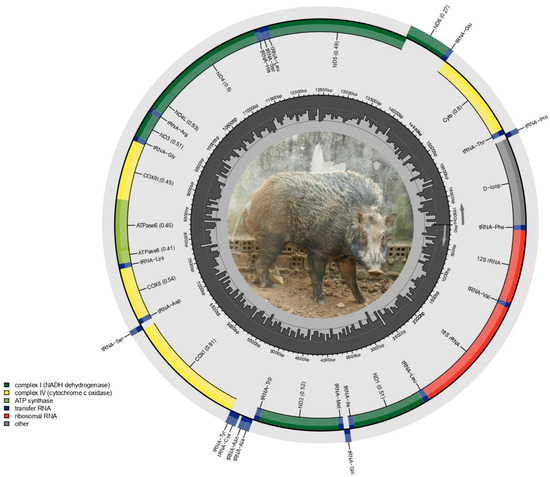 The mitochondrial DNA (mtDNA) is a circular, double-stranded DNA molecule, containing 37 genes and a non-coding control region (D-loop). Mammalian mtDNA is approximately 16.5 kb in size and is characterized by high copy number, maternal inheritance, haploid nature, and absence of recombination [9]. Such characteristics make mtDNA a valuable molecular marker, providing insights into the study of genetic diversity, population history, and evolutionary origins [10]. Of the mitochondrial genome, the cytochrome b gene has been extensively studied to assess the genetic relationship among various pig breeds, serving as an essential tool for phylogenetic analysis and species identification [11,12,13,14]. An evaluation of mtDNA showed that native Vietnamese pigs were genetically diverse, sharing genetic patterns similar to pigs originating from neighboring countries [15,16]. Another study on the sequence variability of cytochrome b among Vietnamese Central Highland pigs revealed the close relationship between Vietnamese wild boars and Asian pig breeds [17]. Recently, the complete mitochondrial genome of several Vietnamese domestic pig breeds, namely I pig, Dong Khe pig, and Ha Lang pig, has been reported, aiding in the efforts to trace the origin of Vietnamese pig populations [18,19,20]. However, the mitochondrial genome of the Vietnamese wild boar and its phylogenetic background are still poorly understood.