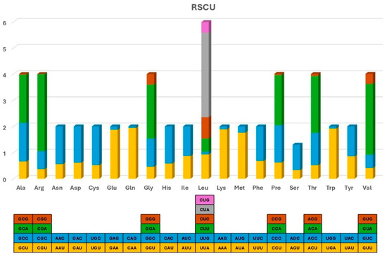 The relative synonymous codon usage (RSCU) of the protein-coding genes in the mitogenome of Sus scrofa. Codons that specify the amino acids are shown on the X-axis.