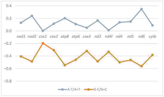 AT and GC skews of 13 protein-coding genes in the Sus scrofa mitogenome.