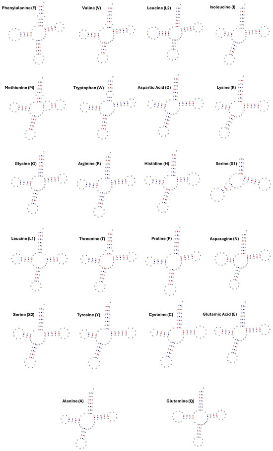 - Lowe, T.M.; Eddy, S.R. tRNAscan-SE: A program for improved detection of transfer RNA genes in genomic sequence. Nucleic Acids Res. 1997, 25, 955–964. [Google Scholar] [CrossRef]