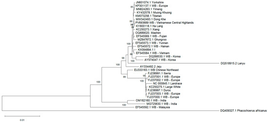 To determine the molecular location of the Vietnamese Central Highland Sus scrofa in the evolutionary tree and its genetic relationship with other pigs, a total of 32 Sus scrofa whole mitogenomes were subjected to phylogenetic analysis. This includes domestic pig breeds from Asia (8), Europe (4), and Vietnam (4), and wild boars from Europe (5), China (4), Korea (2), Vietnam (2), India (2) and Malaysia, with Phacochoerus africanus used as an outgroup [30]. The mitogenomes were aligned using the ClustalW algorithm of MEGA12 [27]. The Tamura and Nei model was used as a genetic distance model [31]. A Neighbor-Joining tree was constructed using 1000 bootstrap replicates.