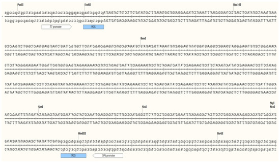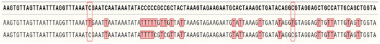 Genomic DNA was extracted from six tissue types and subjected to bisulfite con-version. PCR amplification was performed using mtDNA methylation-specific BSP primers and BSP-amplified primary sequences (No. 16 and No. 21, Table 1; 16# and 21#, Table 1) previously developed by our research group for E. carinicauda mitochondrial genome analysis [23]. The primer sequences are shown in Table 2. The PCR protocol consisted of initial denaturation at 95 °C for 2 min, followed by 30 cycles of denaturation (95 °C, 30 s), annealing (55 °C, 30 s), and extension (72 °C, 45 s). The final products were stored at 4 °C. Following the gel extraction of the PCR products, sequencing was conducted by Sangon Biotech (Shanghai, China). Tissue-specific methylation rates were calculated by aligning the sequencing results with the reference mitochondrial genome of E. carinicauda and the analysis of the bisulfite sequencing data. Examples of specific comparisons are shown in Figure 1, Figure 2 and Figure 3. The methylation in the amplified region of each primer was mainly CpG methylation, while CHG and CHH types of methylation were also present. The methylation rate (%) was calculated as follows: