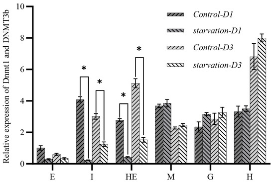 Expression characteristics of DNMT1 and DNMT3b genes in different tissues before and after starvation. Note: E: eyestalk; M: muscle; HE: hepatopancreas; H: heart; G: gill; I: intestine. * means significant difference (p < 0.05).