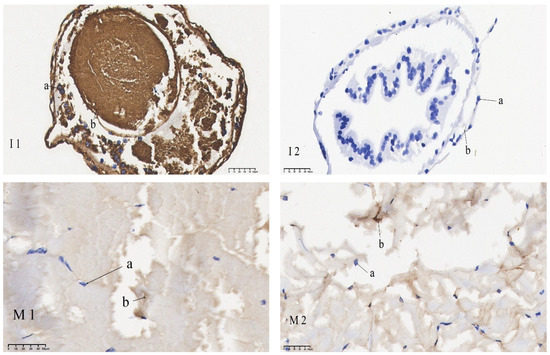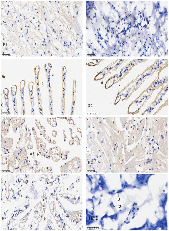 mRNA hybridization signal of DNMT1 in different tissues of control and starvation groups. Note: E: eyestalk; M: muscle; HE: hepatopancreas; H: heart; G: gills; I: intestinal; 1: control group; 2: starvation group a: nucleus; b: positive signal.