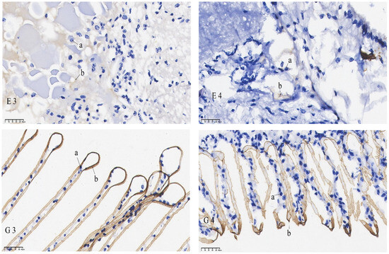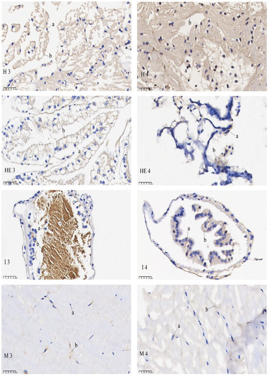 mRNA hybridization signal of DNMT3b in different tissues of control and starvation groups. Note: E: eyestalk; M: muscle; HE: hepatopancreas; H: heart; G: gills; I: intestinal; 3: control group; 4: starvation group; a: nucleus; b: positive signal.
