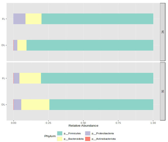 The contact time between young chicks and the litter plays a major role in the gut microbiome population and establishment [75]. This is evident in the comparison between DL and FL, and the likelihood of a chick being rapidly colonized by this anaerobe non-forming spore family is low. A longer time is typically needed for its appearance in the gut microbiota in young chicks. This may be accelerated when raised with older birds or on litter rolled over for several production cycles, as evidenced by the higher number of anaerobic bacteria groups in the DL birds. In addition, the interaction between the chicks and DL will not allow a gradual development of microbiota, rather, the chicks will acquire full or part of the litter microbiome [63].