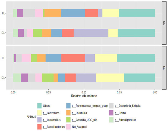 Relative abundance of the top 10 genera. DL = Dirty litter, FL = Fresh litter, NC = nonchallenged, SE =Salmonella challenge.
